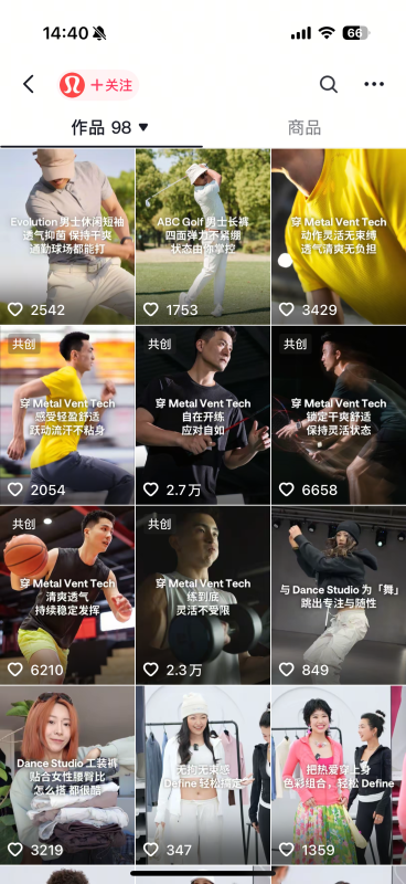 打開Lululemon的抖音主頁,除了「每天上新直播」外,所有的視頻首頁圖都是白色居中大字標出產品的賣點,例如「輕盈版跑步夾克,夏日自在開跑」,「感受輕盈舒適,躍動流汗不粘身」,把圖換掉,我說這是Nike或者優衣庫的物料都可以。