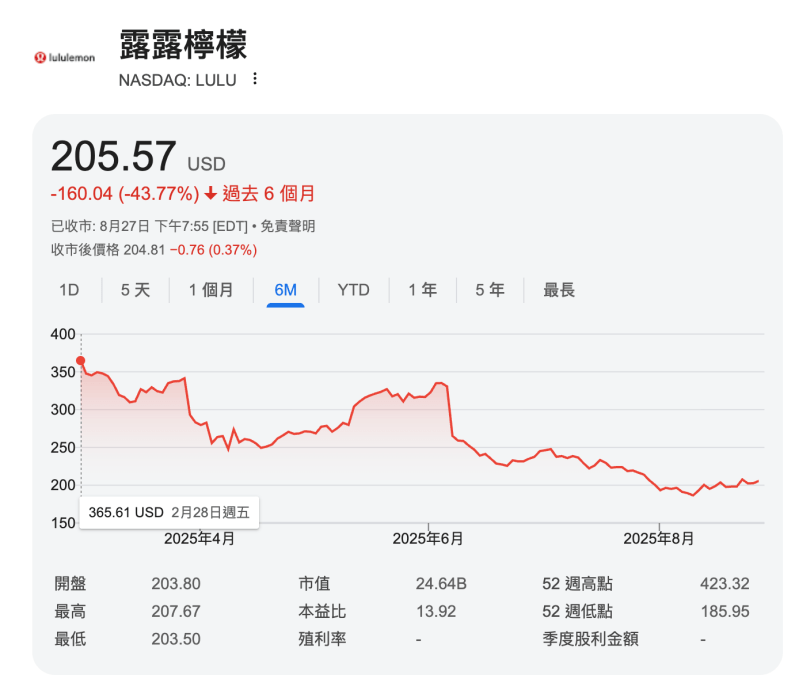 如果你最近有留意美股市場,往上看是英偉達、特斯拉等科技「七姐妹」風風火火拉大盤,往下看你會發現一個熟悉的名字:Lululemon. 今年6月5日財報公佈後,暴跌超20%,一夜蒸發數百億美元市值。再把時間線拉長看,52週最高點432, 最低點185,現在依然在190-200之間徘徊。明明一年前股價還在500左右的巔峰,一年就直接腰斬。